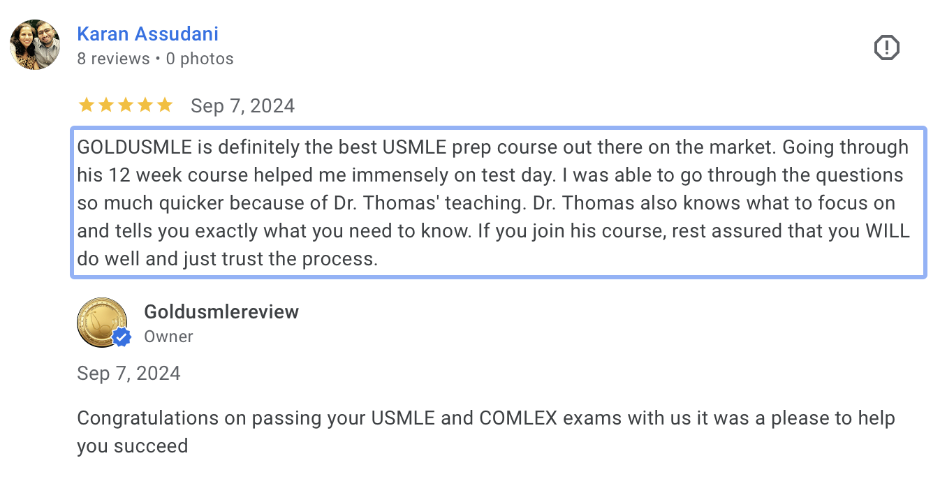 Great course ! Left speechless after going through Dr. Thomas’s review course for USMLE Step 2CK. What an amazing course with all the high yield information along with the latest and current updates for the USMLE exams. If you are looking for a review series that guides you through each and every step of the way, this is the one to join my fellow colleagues. There was never a dull moment. Every second of the course, my colleagues and I were being engaged the whole time via active learning. I would like to thank Dr. Thomas and his staff for preparing me for all of the three USMLE exams.